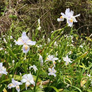 シャガ(射干) 別名、胡蝶花 アヤメ科アヤメ属 里山でよく見かける 親しみ深い花だけど〜 湿った暗い谷で 咲き乱れていると 妖しい美しさに 💙ドキッとさせられます