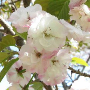 万里香。 八重咲き中輪。 蕾は紅色ですが、咲くと白いので→縁とのコントラストが綺麗な桜。 香りが強い桜で、例年より2週間ほど早い開花です。