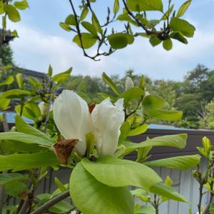 白いモクレン 今年は五月雨式に3月末に開花、4月初めに2度目の開花、そして今3度目の、少し小ぶりなお花が綺麗に咲いてきました。 雨が多いせいか鳥さん達にも食べられず、綺麗なままです😊 新しい葉っぱの中に咲いています。