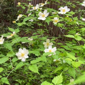 シロバナヤマブキ (白花山吹) バラ科、ヤマブキ属 花友さんからひと枝貰い さし木で育てて2年 こんなに大きく育ちました 黄色で咲くヤマブキの色変わりの品種で花色がほとんど白に近い薄クリーム色 よく似た名前で間違いやすいのですが大きな違いは 花ビラの枚数です シロバナヤマブキ5枚 シロヤマブキ4枚