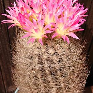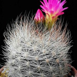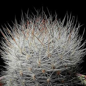 【銀翁玉(ギンオウギョク)】 チリ原産、サボテン科 黒っぽい肌に無数のトゲが巻き付くサボテン。 草丈は10センチから20センチくらい。 球形ないし短い円筒形で、直径は10センチくらいになる。 春には頭頂部のトゲの中からピンク色の花を咲かせる。 宇部市ときわミュージアムにて