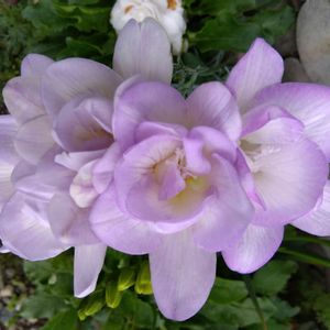 八重咲きフリージア❤️🩷💛💜🤍 混色の球根を花壇と鉢に分けて植えていました❣️ どんな色が咲くのかなぁ⁇と思っていましたら。。。 花壇には❤️🩷 鉢には 🩷💜🤍💛 花が咲きました✨ 雨の中、鉢のpicを撮影しながら、 とてもよい香りに癒されました😊💕