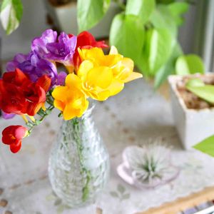 おはようございます! 今日は朝から良いお天気☀️ ベランダの植物の水やりでは、今年初めて帽子をかぶりました♪ 写真は、我が家の八重咲きフリージア♡ 三色目の赤いコが咲き始めましたよ😊