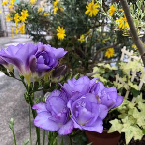 こんにちは😃 やっと八重咲きフリージアのパープルが咲きました💜 失敗して黄色のフリージアと同じ鉢に植えてしまったので花が終わったらそおっ〜と球根を分けるつもりです💦 黄色は繁殖力が強くて、他の色のフリージアと混ぜると他の色の球根が消えるのです💛💜
