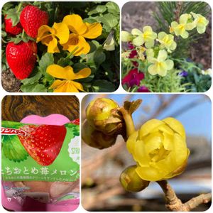 🏷毎月15日はいちごの日に参加します 庭の蝋梅が一輪咲きました 他の黄色いお花も一緒に 投稿します
