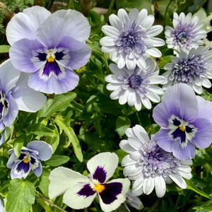 おはようございます❣️ 久しぶりに晴れ間が☀️ 一目惚れ、即買い 笑 ダブルオステオスペルマム「ブルーベリーシェイク」と「シルバー」。 どストライク、文句なしのかわいさです💜🤍 シルバーのセラスチウムとシンプルに寄せてみました🥰