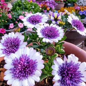 ビオラを全部駐車場に集めたとたん、目立つようになったダブルオステオスペルマム🤍💜🤍 ビオラの撤去進んでいません💦