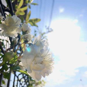 朝日を浴びる白モッコウバラ 現在5分咲きくらい 本当に良い香りです✨