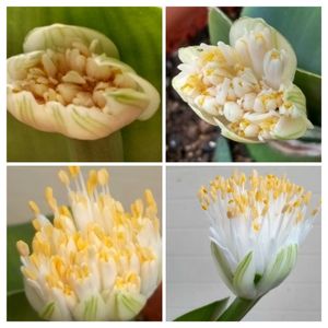 3年目のマユハケオモト 1年目は咲いたのを買ってきて 2年目は咲かず 3年目の今年は やっと家で咲かせたので 感動ものです😃 夏に茶色くなった葉っぱを切ったので 何処から花芽が出るか期待もしていなかったら 葉っぱの裏から気付かない間にペッタンコで顔を出していて 1週間で立派な刷毛になりました🤗 何度見ても不思議で可愛いお花です🥰
