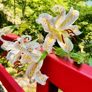 早朝☀️おはようございます🌿 今年も山本不動尊へ🚙 山百合が綺麗に咲いていました✨ ②花手水も涼しげで良いですね🎐 ③夏の緑と綺麗な小川の水に癒され ました🌿✨