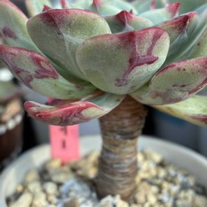 こんにちは😃 ✨ビクトリー✨ 今年は日当たりのいい多肉棚に置いたら、もう歌舞伎模様が出てきた🤩 上から見ても葉先が赤くて可愛い🥰