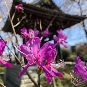 ミツバツツジ お散歩中、お寺のミツバツツジが 色鮮やかだったのでパチリ📸 お寺の境内にて。