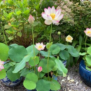 おはようございます😃 この時期は蓮のお花の投稿が多くなります😁😁 昨日の雨を☂️の下で乗り越えて今朝5輪咲いてくれました。 白蓮は1輪なので目立ちませんが私にとっては夢のコラボということで😁😁 今日はお友達が2人見に来てくれます。 嬉しい1日になりそうです💕💕