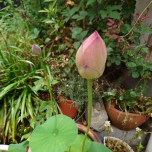 🪷茶碗蓮のお華 「ハス」の園芸品種の中でも小型の品種の総称です。 葉の高さも約70cm位。 いくつもの系統があり、鉢栽培に用いられます。 7月から9月頃淡紅色〜白色の花を咲かせます。 名前は、茶碗のなかでも育てられると言うことから。 ハス科ハス属の水性多年草 学名 Nulumbo nuciferacx. 英名 Dwarf sacred water lotus. ✧今年の3月13日に鉢に1/3位の土(田んぼの土見たいの)を入れ 茶碗蓮の根を植え水耕栽培にし、ベランダで育てています。 初めに出ていた茶碗蓮の葉っぱ・直径5cmのが10枚位は、枯れた葉っぱとなり、水の中の黒くフニャフニャの腐った茎も一緒に捨てました。 …すべて枯れてしまうかと心配しましたが、茶碗蓮の鉢の水を2日に1回変えたり、鉢がなるべく日当たる方に移動したりしました。 その後6月から、直ぐ大きな葉っぱが次々に出て来ました。大きな葉っぱが8枚くらい出揃い…ついに今朝〜花芽が1つやっと立ち上がってくれました𓂃 𓈒 𓂂𓏸𓏸ꕤ*.゚ 🪷次回は、この茶碗蓮がパカッと咲きしだいpicしますネ〜♡