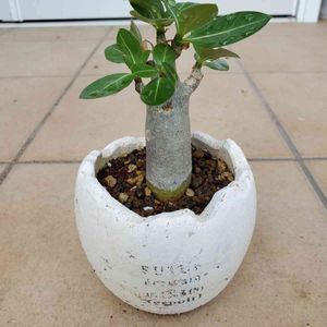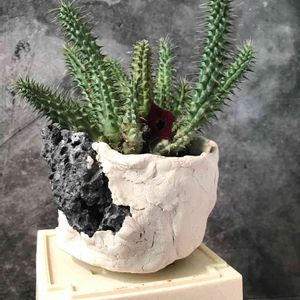 フェルニア 修羅道。今年二回目の花、付き。 富士溶岩貼り付け自作鉢に植え替えました。陶土は『ひなたぼっこ』。