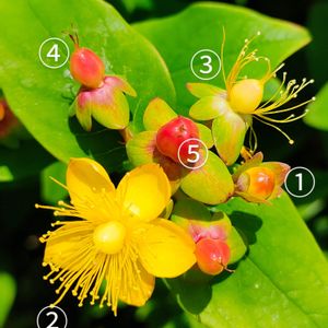 🌸ヒペリカム アンドロサエマム🌸 赤い実がお花屋さんによくあるヒペリカムです。 ①つぼみ から順番に育ちます ②花は2~3cm真っ黄色で可愛い。 ③真ん中の子房が残って赤くなります。 ①つぼみと④赤い実はよく似ていますが、ガクの反り方が違いますよ。 割と早くに⑤赤い実に、なるので、つぼみから赤い実までが見られるこんな写真が撮れました!