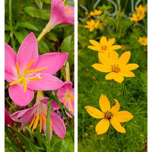 🌸ゼフィランサス サフランモドキ🌸 🌸イトバハルシャギク🌸 今年も華やかな色の花が咲いて来ました! 我が家の晩春の、常連さんです。 サフランモドキは雨上がりに突然咲いてきて2日ぐらいは綺麗です🤭 イトバハルシャギクは 背が低くて葉がコスモスのような糸葉してます! どちらも宿根なので 私には有り難い花ですよ🥰