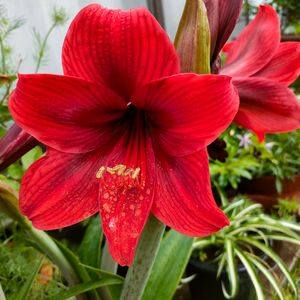 🌸アマリリス🌸 一昨年から復活して咲くようになって来ました! 日が当たるとギラギラして撮りにくいので こんな曇りの日が良いかも! 真っ赤っかでいくつもつぼみがあります(*^^*)