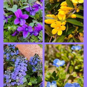 🌸春爛漫🌸 またまた4分割で失礼しますm(*_ _)m ✱名も知らぬスミレ! 宿根するので毎年咲くみたい! ✱カロライナジャスミン ほかの木に巻きついて大きくなってます😅 ✱アジュガ これ、よく増えるね! 空いたとこに植えとくとすぐに根を張ります🤩 ✱ネモフィラ! ではなくてオオイヌノフグリよ! 可愛いちっちゃなブルー💙