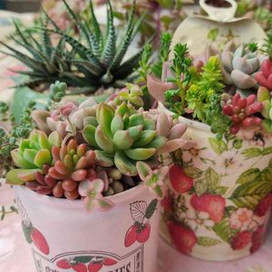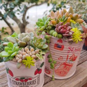 こんにちは〜🎵 いちご🍓のリメ缶が完成~😆 早速寄せ植えしました。 リメ缶も寄せ植えも出来たてのほ〜やほやですよ〜🎶