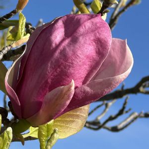 Magnolia liliiflora/Magnolia. Magnoliaceae. Magnoliales. Magnoliopsida. Tracheophyta Commonly called/Lily Magnolia. Purple Magnolia. Tulip Magnolia Native to/Southwest China Symbolism/Purity. A love for nature. Health and Good luck *Genus of about 125 species *Dark green leaves, to 8in(20cm)long *Goblet-shaped,purplish pink flowers,to 3in(8cm)across,are borne in midspring. *The founder of the Magnolia liliflora hybrid,(Magnolia x soulangeana),is Etienne Soulange-Bodin,who crossed this flower with Magnolia denudata in 1836. Photographed 4/2 9:33am 2025 Posted 4/3(Friday) 12:03pm 2025