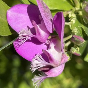 Polygala myrtifolia/Polygala. Polygalaceae. Polygalales. Magnoliopsida. Tracheophyta Commonly called/Myrtle-leaf milkwort. Sweet pea bush Native to/South Africa Symbolism/Success. Overcoming challenges *Genus of about 500 species *Mid-to deep green leaves, 1-2in(2.5-5cm)long. Short, leafly, terminal racemes of purple-vinded,greenish white flowers, to 3/4in(2cm)long, with created keel petals, are borne from spring to autumn. *The genus mame, Polygala. comes from the Greek words ‘poly’ means “many” and ‘gala’ means “milk”. *Polygala myrtifolia became naturalized in Australia starting in 1887. *The discovery and naming of Polygala myrtifolia is not at tributed to a single discover. Photographed 10/19 9:19am 2025 Posted 10/20(Monday) 12:12pm 2025