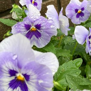 雨上がりのパンジー 徒長しても、まばらになっても まだ頑張って咲いてくれてる パンジーを抜いて、新しい花に 植え替えできないわたし(*≧∀≦*) ʅ(◞‿◟) 未練タラタラ、、、 花壇にも 性格でるんだなぁ、、、