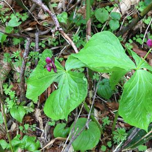 4月24日 札幌市手稲区 エンレイソウ と コジマエンレイソウ 延齢草 と 小島延齢草 同じ株元からエンレイソウとコジマエンレイソウが生えているように見えます。 とっても不思議・・・。
