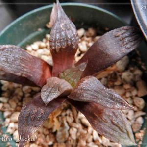 ハオルチア、ジャッカル。強烈な日差しで四緑に得てしまったり、こじらせてひからび寸前になったり、何度も生存危機に見舞われながらも耐え抜いた根性はオルチア。今は珍しく厚みのある葉を出して調子良さげ。