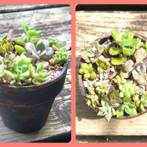 4/7に、三つ作ったちまちま寄せのラスト三つ目です。 小さな小さな苗たちは、棒多肉やよれよれになってた多肉さんたちから4/3にチョンパ✂️したものです。元の様子は1/26〜2月前半に投稿しています。 お気に入りの鉢に植えました。 どれも元気に根付いて育って欲しいです✨