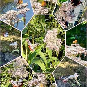 💙。♥︎。・゚♡゚︎空と植物。♥︎。・゚♡゚︎🩷 |ョ'ω'〃)おはようございます♪︎ 🍀GS『今日のお花』フジバカマ♡ 🩷①昨年10月〜梅小路公園の朱雀の庭で出逢ったフジバカマさんと蝶々さんたちをコラージュ♪ 🩷②同じく朱雀の庭〜フジバカマさんとアサギマダラさん♡ 🤍③先週末に京都府立植物園での白いフジバカマさん♡ 🌈⛲️✨④京都府立植物園の噴水〜虹がかかっていましたよ〜10月に向けて幸運の虹を皆様にお届け〜*。.:*ヽ(*´∀︎`*)ノ*。.:*