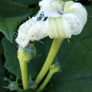 カラスウリの続き 毎日通る道なのに、日が短くなったおかげで存在に気付いた カラスウリは雌雄異株です。 ここは雄株だけ、雄花です。 残念ながら実がならない😅