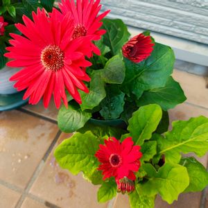 春に種まきし、種から育てたガーベラマジョレッテ。 10粒まいて、苗にできたのは、2株。 夏越ししてくれました。 今咲き誇ってますꉂ 🤭 ミックスの種だったので、色は混ざっていたはずですが、なんと2株とも、真っ赤‼️でした😅 2株目の花が上がってきたのは、1株めから2ヶ月くらい送れてるかな💦 同じく管理してるつもりでいましたが、のんびり屋さんなのかな……💦 種袋によると、ピンク、黄色、白、オレンジもあるようでしたが、赤2株‼️ クリスマスカラーですね💦