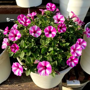 こんばんゎ(ॢ•ᴗ• ॢ) *:・゚✧ 挿し芽ッ子💜 次から次へと 良く咲きますpwのあふれ咲きペチュニアラズベリージャム💜( *^艸^) 上⬆に見えるのが親株(*^^*) 親株の方は切り戻しばかり……😅😆 中々🆙出来ずにいます ( *^艸^)