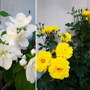 バイカウツギ♡❀°*ο🌿 純白で清楚な色 低い木で、育てやすいとの事 薔薇✨ イエローは、華やかで見ただけで元気に💛🌹 お隣の花ですが毎日見る事が出来て幸せです🍀 🏷️元気いっぱいビタミンカラー 🏷️蕾組の子 参加します🍀