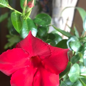 マンデビラです。 自然大好き派😘、兼園芸もやっています派です。この花は昨年の初夏に購入し、夏から秋まで十分花を楽しんだ後、大きく剪定し冬越しに備え家に取り込みました。 冬の間はラン類と同じ管理をしていました。その結果この開花に繋がりました。ランと同じ管理で良かったみたいです🤗。ツボミも見えていますのでこのあとも楽しめそうです。この花は長持ちして最高なのですが、雄蕊、雌蕊が見えないのが残念です😅。