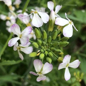 狭い庭に、ダイコンバナがたくさん増えてる😊 ダイコンバナって、別名「オオアラセイトウ(大紫羅欄花)、「ショカッサイ(諸葛菜)」とか「ハナダイコン(花大根)」とも言うんですね。