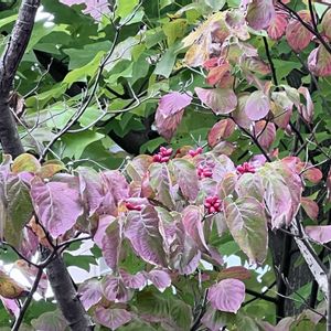 おはようございます🌿 ハナミズキの葉の紅葉🍁 実も赤くなり 可愛らしいです。 左下↙️赤い実の横に見える白っぽいのは花芽でしょうか?