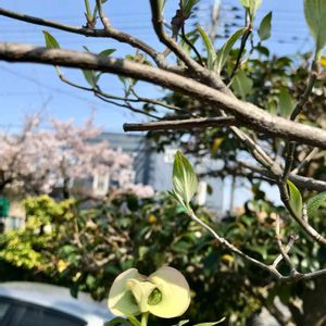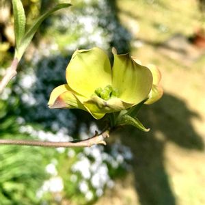ハナミズキ。 桜からバトンを渡され、咲き始めました☺️ グリーンのこの子が満開になれば、ピンクのハナミズキが時間差で咲き始めます😊