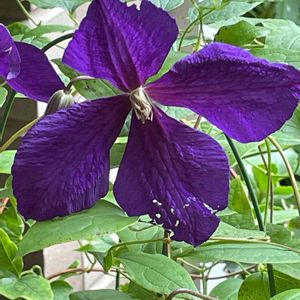 💠クレマチス💠 💙ジャックマニー💙 おはようございます😃 今日はチームブルーの大切な花友さんのお祝いpic㊗️にさせていただきます。 ㊗️かすみ草さま 5100pic🎉 ㊗️がっちゃん 2100pic🎉 ㊗️k57さま 600pic🎉 おめでとうございます㊗️🎉🎊 これからも美しく楽しいpic見せてくださいませ💖😃 春先になっても目を吹かなかったジャックマニーでしたが、昨年挿し芽をしておいたのが、付きました。良かったあ💕💖💖 花弁はかくばったダイヤモンド形で、4〜6枚。暗紫色の花弁と、黄色い花芯とのコントラストが良いです。ヨーロッパでは紫のクレマチスと言えば、ジャックマニーといわれるほど。 品種改良においても、濃色花作出の交配親となっているそうです。 ジャックマニーは大好きなクレマチスですが、何度も失敗し、枯らしてしまいました。昨年念願の花をたくさん咲かせられてホッとしていたのでした。 マイガーデン💕 🏷美しく青きドヨウ 🏷ファンタスティックブルー 🏷青い花マニア 🏷青い花とその葉を写そう!2022 🏷おしゃれな土曜日♪ 🏷幸せの青い花 🏷今日も元気で に参加させていただきます💕