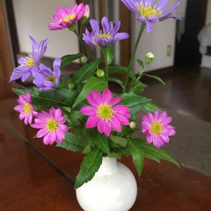 都忘れ(ミヤコワスレ) 青空 和風の薄紫色の可憐な花です。 昨日投稿の薔薇について、アドバイスや心配してくださった皆様に捧げます。感謝(ㅅ´ ˘ `) 左奥の葉は、薄紅肥後すみれで、植え替えした時に、分かれたのを入れました。大きくなぁれ! 都忘れは、本州、四国、九州の山地に自生するミヤマヨメナの栽培品種らしい。鎌倉時代、承久の乱に敗れて佐渡に流刑になった順徳院が、この花を見て心を慰めたということから名がついたとされているようです。 原産地 東アジア 耐寒性 強い 耐暑性 やや弱い 特性・用途 落葉性 栽培環境 日当たりと水はけのよい場所に植えつけましょう。水はけの悪い場所に植えつける場合は、盛り土したり、腐葉土を混ぜたりして水はけをよくしておきます。暑さから守るために、6月から秋の彼岸まで、鉢植えのものは半日陰に置いて管理しましょう。 肥料 鉢植えは、3月から6月に、緩効性の化成肥料(N-P-K=10-10-10)を施します。1回に施しすぎないように注意しましょう。庭植えの株に、肥料は特に必要ありません。 病気と害虫 病気:特にありません。 害虫:アブラムシ、ナメクジ 4月から11月、新芽や花芽にアブラムシがよく発生します。大発生すると葉についた排せつ物がカビて見苦しくなるので、防除しましょう。 5月から7月、多湿になるとナメクジの活動が活発になり、特に新芽や花芽が食害されます。ナメクジは、夜行性で、昼間は鉢の下や石の下に隠れているので、探して捕殺しておきましょう。 用土(鉢植え) 赤玉土(中粒)5、腐葉土3、酸度調整済みピートモス2の混合土など、水はけのよい土を好みます。これにリン酸分の多い緩効性の化成肥料を適量混ぜてから、株を植えつけます。 植えつけ、 植え替え 5月から6月と9月から10月が植えつけ、植え替えの適期です。根がよく伸びて根詰まりを起こしやすいので、鉢植えは、毎年植え替えると成長が促進されます。庭植えは、数年に1回、株分けを兼ねて植え替えるとよく育ちます。 ふやし方 株分けの適期は5月から6月と、9月から10月です。植え替え時に株を切り分けましょう。 主な作業 花がら摘み:花期の4月から6月、花がらを放置すると、病気の原因になります。ときどき取り除きましょう。 切り戻し:早春に促成栽培され、早い時期から咲いた株は、花が少なくなった3月から4月に弱剪定をすると、わき芽が伸びて再度開花が楽しめます。 出典:みんなの趣味の園芸 ❁✿✾ ✾✿❁︎❁✿✾ ✾✿❁︎ 薔薇を今朝、皆様のアドバイスを参考にして植え替えました。 コメント下さった方々、本当にありがとうございました。受け皿も土も、器も、参考にさせて頂きました。 何回も質問に答えてくれて、詳しく教えてくれたかずさん、ありがとう。感謝です。ありがとう(*´ ˘ `ㅅ)💗 あとは、祈りながら見守ります。 分身の挿し木も根づきますように 🙏♡オネ(。>ㅅ<。)ガイ♡
