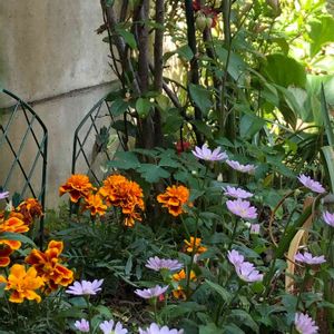 今朝のお庭1 マリーゴールドと都忘れ、奥はオダマキ(まだ蕾)とボケ。ちょっと分かりづらいですね。