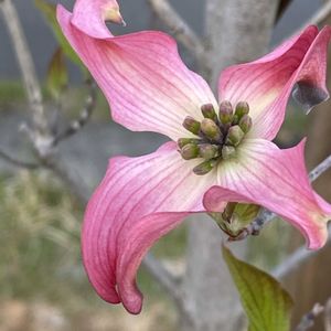 新しい花壇に植えてもらったハナミズキ🌸 19日にpicしたとこだけど、 今日のお花だったので😊 葉も展開してきました😊 3枚目のコーンは、鹿🦌よけです 笑😆