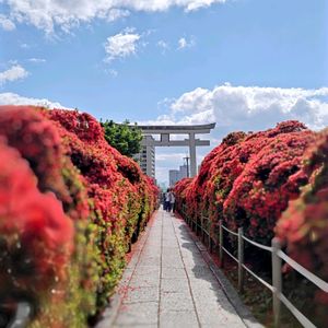 京都府長岡天満宮の霧島ツツジ🔴 大鳥居からキリシマツツジの真紅のトンネルの中央参道があり、両端にキリシマツツジを見たり、八条ヶ池を見ながら進める2つの参道、合計3つの参道があります😀 参道沿いには、約100株・樹高約2.5mものキリシマツツジが真紅の花を咲かせています。 樹齢は約170年前後と推定されています。 (池の向こうに見える和風の建物は、創業明治14年の『錦水亭』と言って、朝堀りたけのこを使った『たけのこ料理』を味わえます🤗)