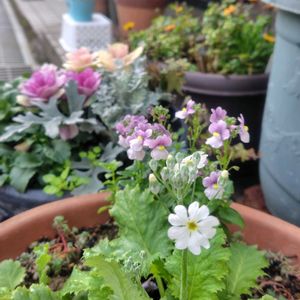 ①雨上がり、白いサクラソウが咲き始めました。 ②③多肉寄せ植え。🎎から🌸のクマちゃんに選手交代!