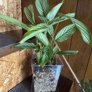 カラテア エリプティカ ビッタタ3月25日(火)植え替えました。 鉢はダイソークリア植木鉢四角4号深型 土はココチップに無機質の組み合わせ。