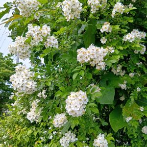 こんばんは ホウノキに絡んで 一番上までいきそうです 真っ白なノイ薔薇です(* ’-')(* . .))ペコリ◝(⑅•ᴗ•⑅)◜..°♡
