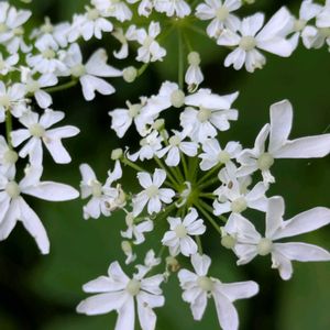 ハナウド 林の縁や堤防で出会うセリ科の花は、遠くからでもよく目立つ 白い水曜日♡🏷 ハナウドは「ウドに似ているけれど葉よりも花が目立つ」というのが由来だそうで、確かに外周の花は装飾花のつもりだろう、特に外側の一花弁は大きくて花弁が2裂している♡ 散形花序といって、いくつかの小さな花の集まりが集まって全体の花の形を作っていてる♪ 頂部の花は両性でよく結実して、早くも若い緑色の実がふさふさと育っている🟢 葉柄の基部はふくらみ鞘状になって茎を抱く🤎 梅雨の時期、まるで唐傘でも広げたように、葉も大きく育っている(ノ*˙˘˙)ノ =͟͟͞͞ ☂