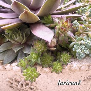 センペルンルン木曜日🎶 わが家のセンペルビウムたちです😊 一枚目は、四月に植え込んだセンペル丼で、五月八日の投稿と比べて随分モリモリしてきました♪ 二枚目はレッドビューティー、三枚目はブロンコ、四枚目は大巻絹、最後はテクトラム(ハウスリーク)です。どれも成長速いですね😅💦 丼の品種は、中央がダイナモ、上の白っぽいのが夕山桜、時計回りに、ブラウニー、ジュディローズ、サマーフロスト、赤巻絹、です。 わが家のセンペルビウムは、これで全部です、と書きかけて思い出しました😅種から育てている最中の、ヒッピーチックスという品種があります。沢山発芽はしたのですが、暑くなってから急速に減って来て、果たして育つのか、怪しくなって来ています💦もし育ったら、後ほどご紹介しますね〜
