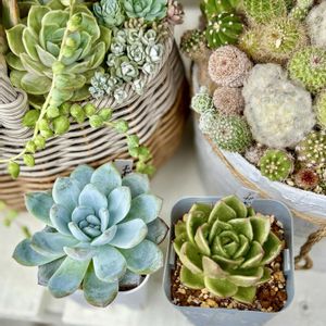 昨日届いたharuharuさん苗 植え付けました👍 青いリメ缶はharuharuさん ナピリを植えている🐰ものと パシフィックグレースを植えたリメ缶は多肉の気持ちさん 作です😆 朝イチ多肉の気持ちさんからの缶は 底穴空いてないのと、プルタブを残して作ってくれてあったのに 開封したときバキッと取れてしまって😭その修理と穴あけからスタートでした😆 フタはグルーガンでつけました👍👍 前のときに頂いたひまわり🌻鉢には 百恵ちゃんお一人様ちょっと小さかったかも🤔何やけどジャストフィット🥰 セブリナ錦はこれもジャスト👍 KAWAII TANIKUと書かれた両端に描かれている緑の水玉? 実は🎄だと思ってたんだわ😅 よーくみたら🌵? 写真もなんだかピンボケ ここのところまた、目がよく見えない😑(近乱老斜のフルコースなので日によって見え方が全く変わるのです🥺) 下手くそな写真で申し訳ない😱 どれもかわいく植えれて大満足でした🥰